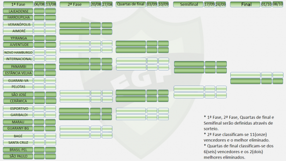 Nesta semana a FGF liberou a tabela da Copa RS. Vai ser no sistema de mata-mata, a exemplo do último ano. A competição, que já foi chamada Lupi Martins, Willy Sanvitto, entre outros nomes, ainda não foi batizada em 2014.