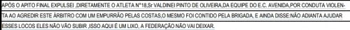 Mas o fato que mais chama atenção na súmula é o relato da expulsão do atacante Dinei, do Avenida, que deixou os rubro-negros revoltados. Descreve o árbitro na súmula: “Após o apito final expulsei diretamente o atleta n° 18, Sr. Valdinei Pinto de Oliveira, da equipe do EC. Avenida, por conduta violenta ao agredir este árbitro com um empurrão pelas costas, o mesmo foi contido pela Brigada Militar, e ainda disse: NÃO ADIANTA AJUDAR ESSES LOCOS, ELES NÃO VÃO SUBIR, ISSO AQUI É UM LIXO, A FEDERAÇÃO NÃO VAI DEIXAR”.